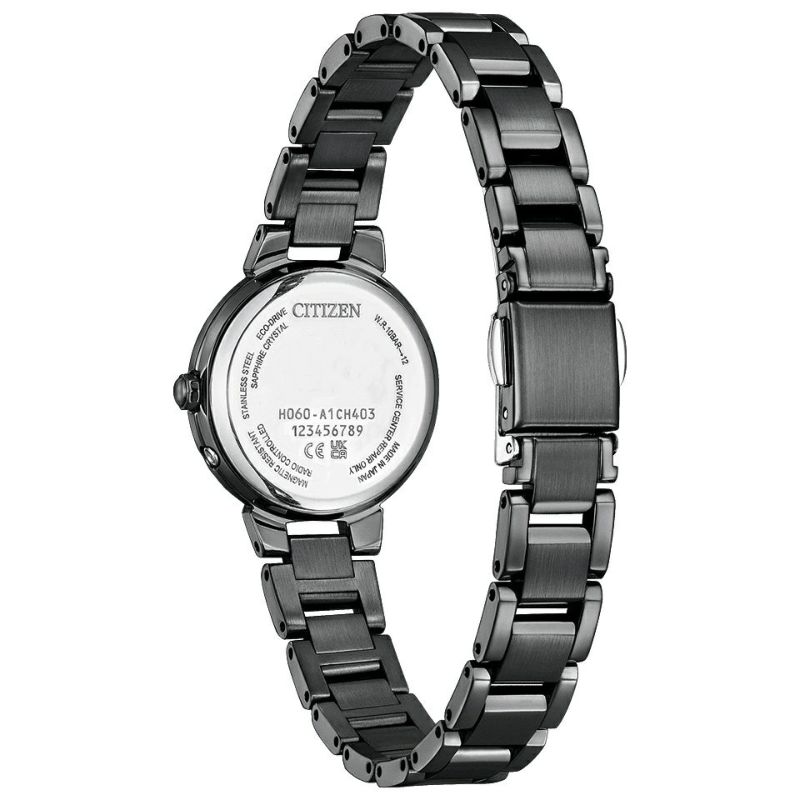 クールな印象のブラックカラーケースに、文字板にはストライプパターンにラメを散りばめた華やかなデザインがポイントです。
