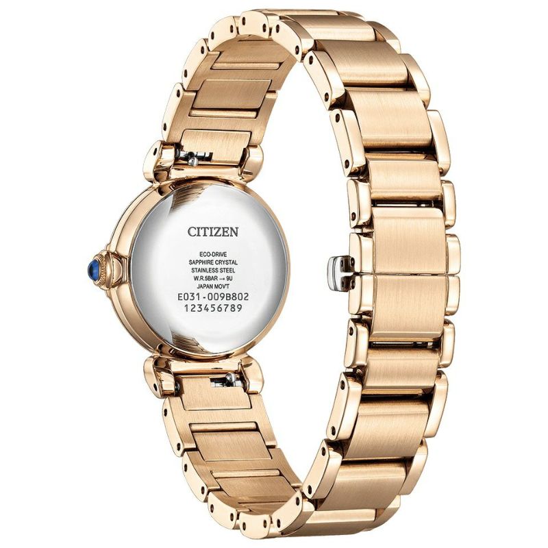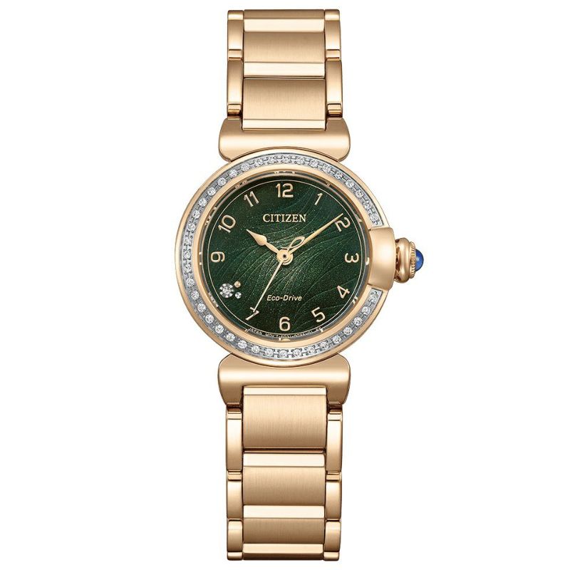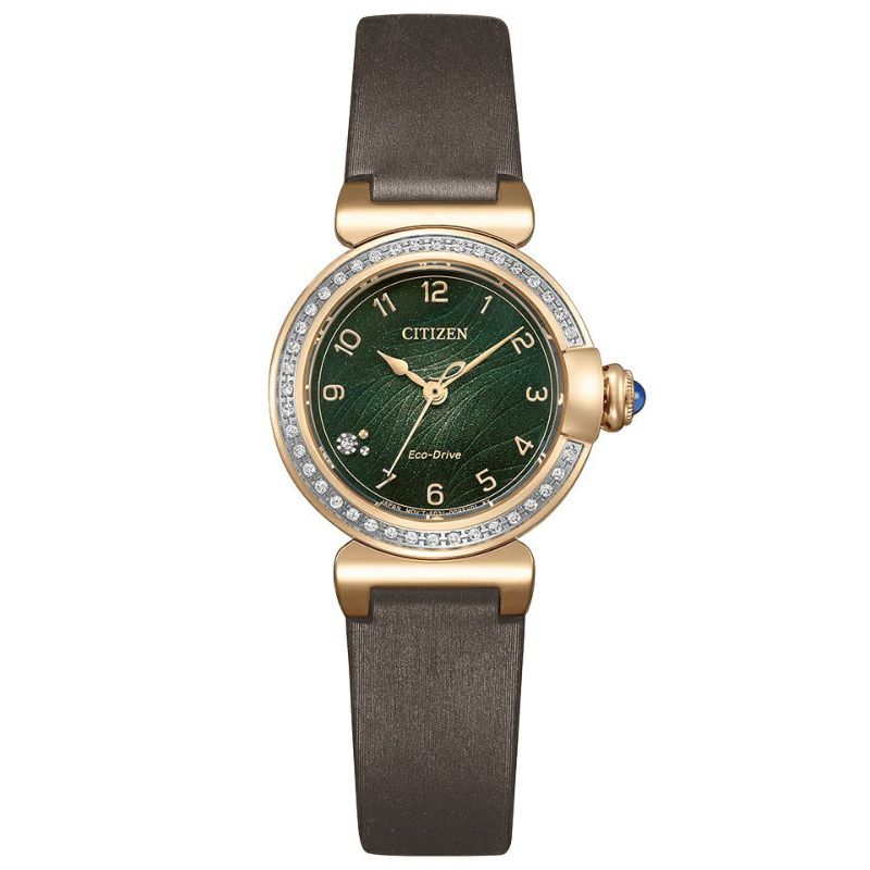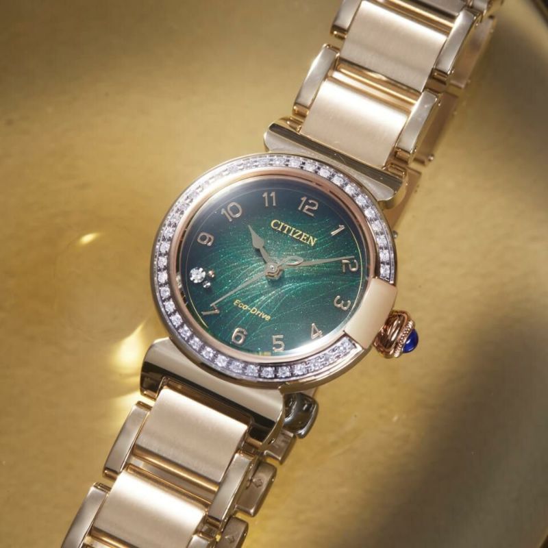 スズランがモチーフで人気のあるROUND Collectionからミニサイズモデルが登場。ベゼルに直径1.1mmの天然ダイヤモンドを39個敷き詰めた存在感のあるケースが、手元をひときわ華やかに彩るジュエリーライクなデザインです。インデックスには、スズランのピュアな印象を表現したアラビア数字のフォントを採用。8時の位置に、スズランのしなやかな葉をつたう雫の輝きをあしらい、フェミニンな優しさと自然の躍動感を表現しました。