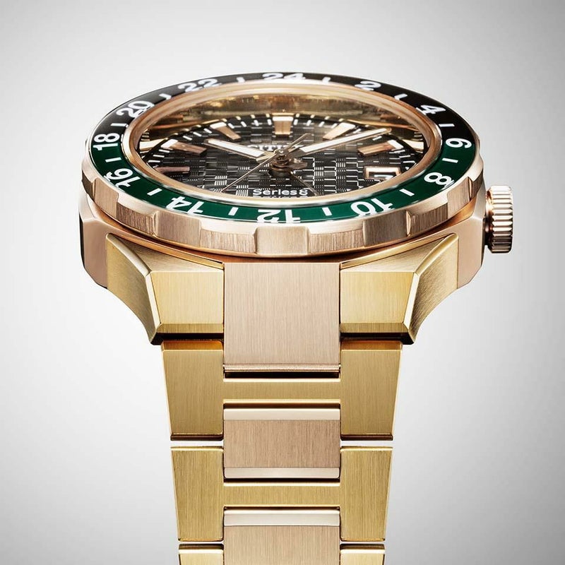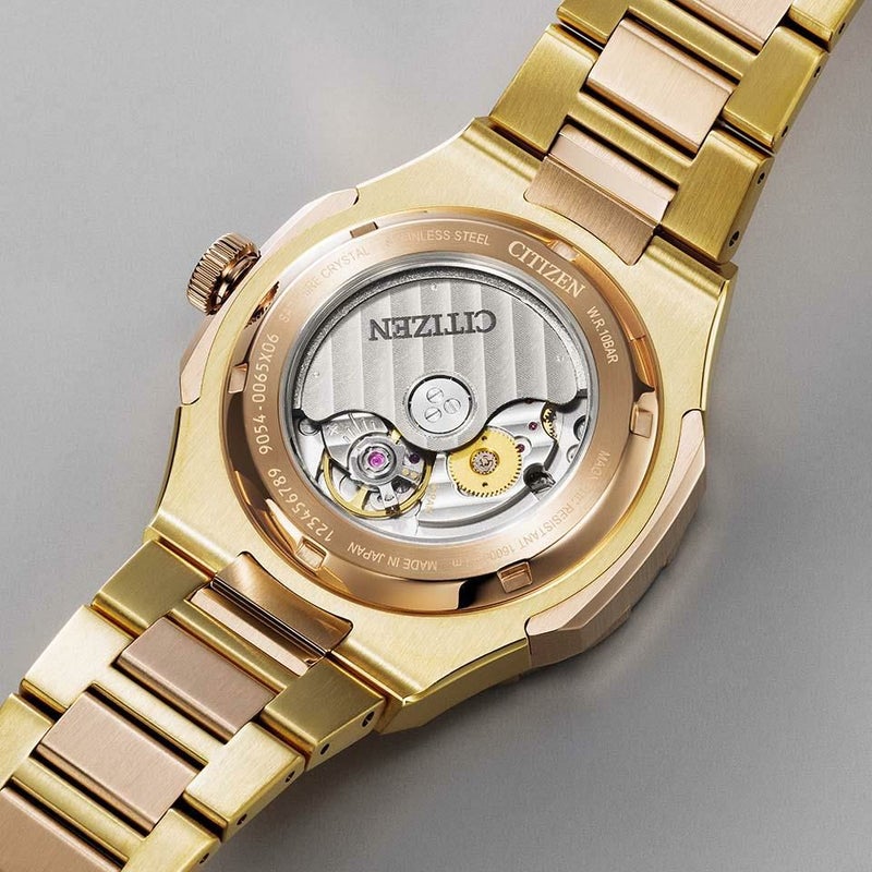 「世界を舞台にした挑戦」をテーマに、ケースとバンドにはゴールドのツートンカラーを採用。イエローゴールドは光輝く都市をウォームゴールドは輝かしい未来をイメージし、ベゼルに配色されたグリーンとブラックが、その輝きをより一層際立たせます。ムーブメントにはGMT機能を備える「Cal.9054」を搭載。GMT機能は、分針・秒針・24時間針を動かさず、時針だけを自由に動かしメインの時刻を1時間単位で変えることができます。また、両回転ベゼルを使用することで最大3つの時刻を確認できます。裏ぶたは、ムーブメントの鼓動を感じられるシースルーバック仕様です。