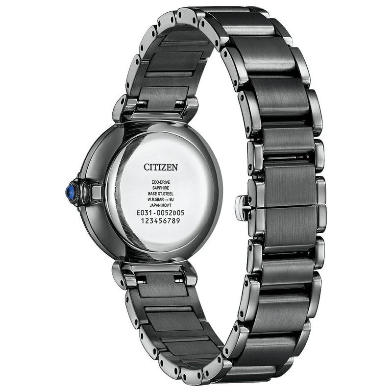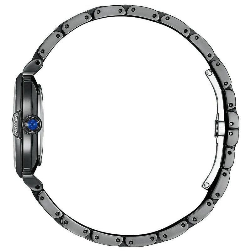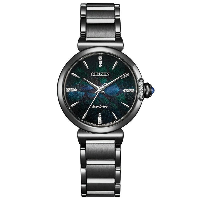 ブラックカラーと神秘的なブルーグリーンを組み合わせた、今までのシチズン エルにはないモダンでエレガントなモデル。ブラックのグラデーションの中に構造色のパターンが浮かび上がり、地層や鉱物を思わせるデザインを表現。4ヵ所のインデックスとケースの3時位置で輝くダイヤモンドが、クールな印象の中にも気品を感じさせます。