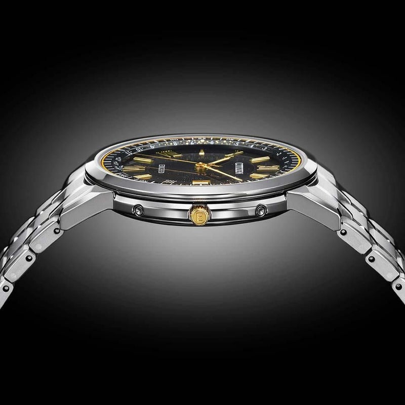 ブラックの文字板をベースに、ゴールドのアクセントカラーを取り入れた華やかな印象のデザインで、新年や新しい門出を祝うにふさわしい配色。