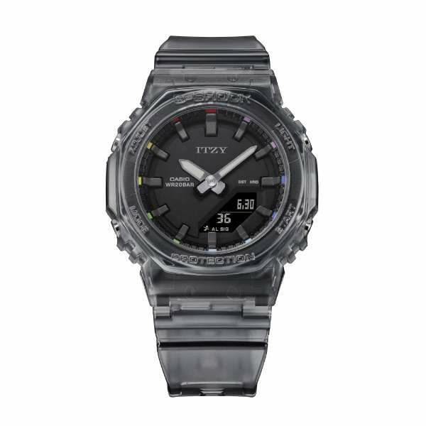 G-SHOCKのアンバサダーを務めるITZYとの待望のコラボレーションモデルです。ITZYの公式グッズであるライトリングをイメージしたマルチカラーをアクセントとしてインデックス上部に配色。シンプルなデザインの中にも、MIDZYへの想いが込められたデザインとなっています。文字板の12時位置にITZYのロゴを配し、裏蓋にもITZYのロゴが刻印されたスペシャルなモデルです。